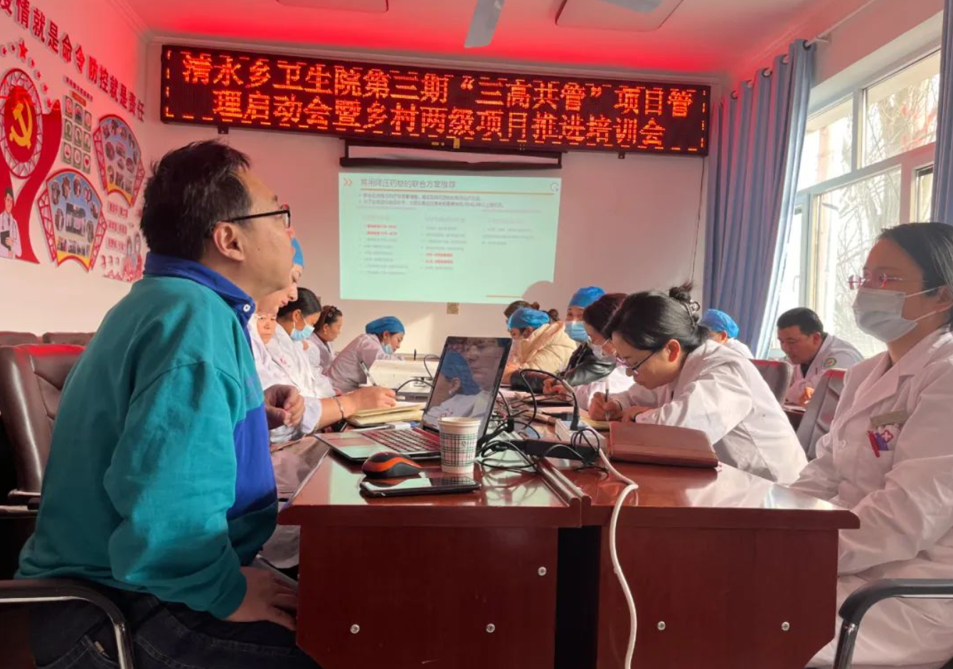 2024年,清水乡第三期“三高共管”项目覆盖我乡500名高血压患者加入“三高共管”项目管理,依托“互联网+智慧医疗”赋能县、乡、村级医生,其提供远程心血体征监测、用药指导和就近就医住院等健康保障服务。该项目由中再集团出资、国家心血管病中心高血压专病医联体指导、中国医学科学院阜外医院支持、万众益心健康管理平台实施,推动青海省首个国家级“三高共管综合防控示范区”实施。项目老师围绕“三高共管”试点项目——青海省循化三期绩效考核方案、信息平台管理,血压计发放、患者规范测血压等开展培训,对前期项目运行存在的困难与问题与参会人员探讨、交流。我院马廷福院长对项目培训老师百忙之中莅临我院授课表示感谢。我院乡村两级“三高共管”项目主管医生各自按入组管理人数,做好第一期、第二期和第三期患者的规范化管理,及时做好每周两次规范测血压和不达标患者提醒管理,各司其职、发挥自身优势,织密患者共管理、同预防、信息通、上下联的健康管理网,提高基层“三高共管”管理能力,让医防融合的共管理念在清水乡高血压患者落到实处,群众普遍得到实惠,助力我乡高血压管理项目起到积极推进作用。